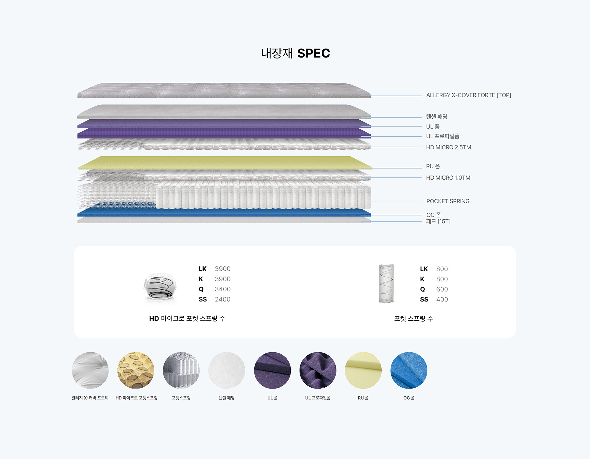 알레르망 스핑크스의 모든 매트리스에는 영국 해리슨 스핑크스사에서 독점 수입한 영국산 HD 마이크로 포켓 스프링을 장착합니다. 최대 8000개 이상으로 구성된 포켓 스프링들이 결합하여 체압분산 효과가 뛰어나며 안정성 및 내구성, 지지력이 우수합니다.