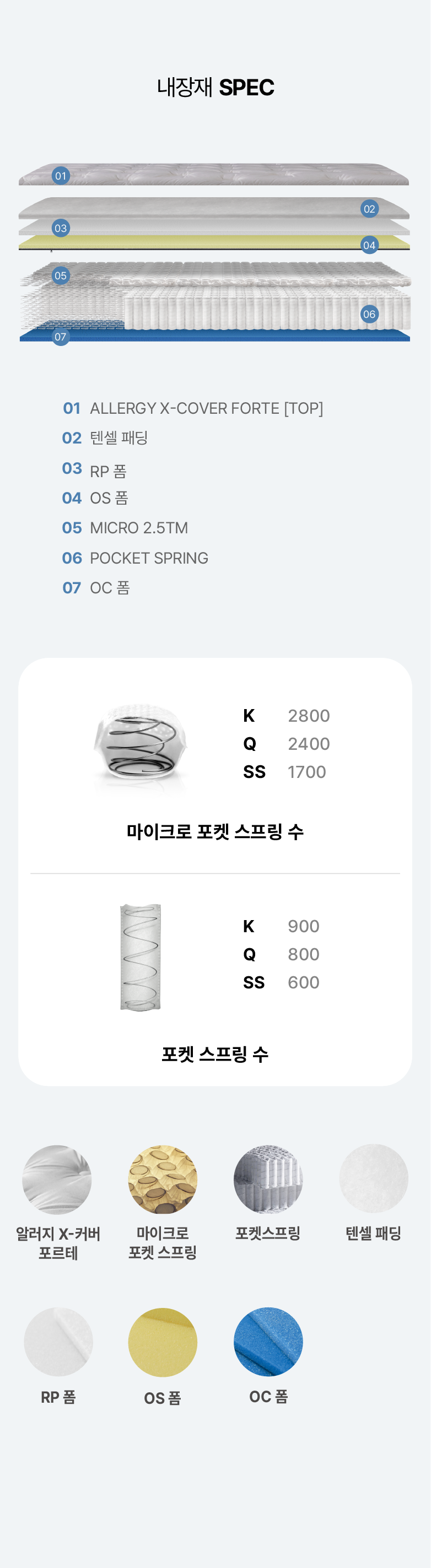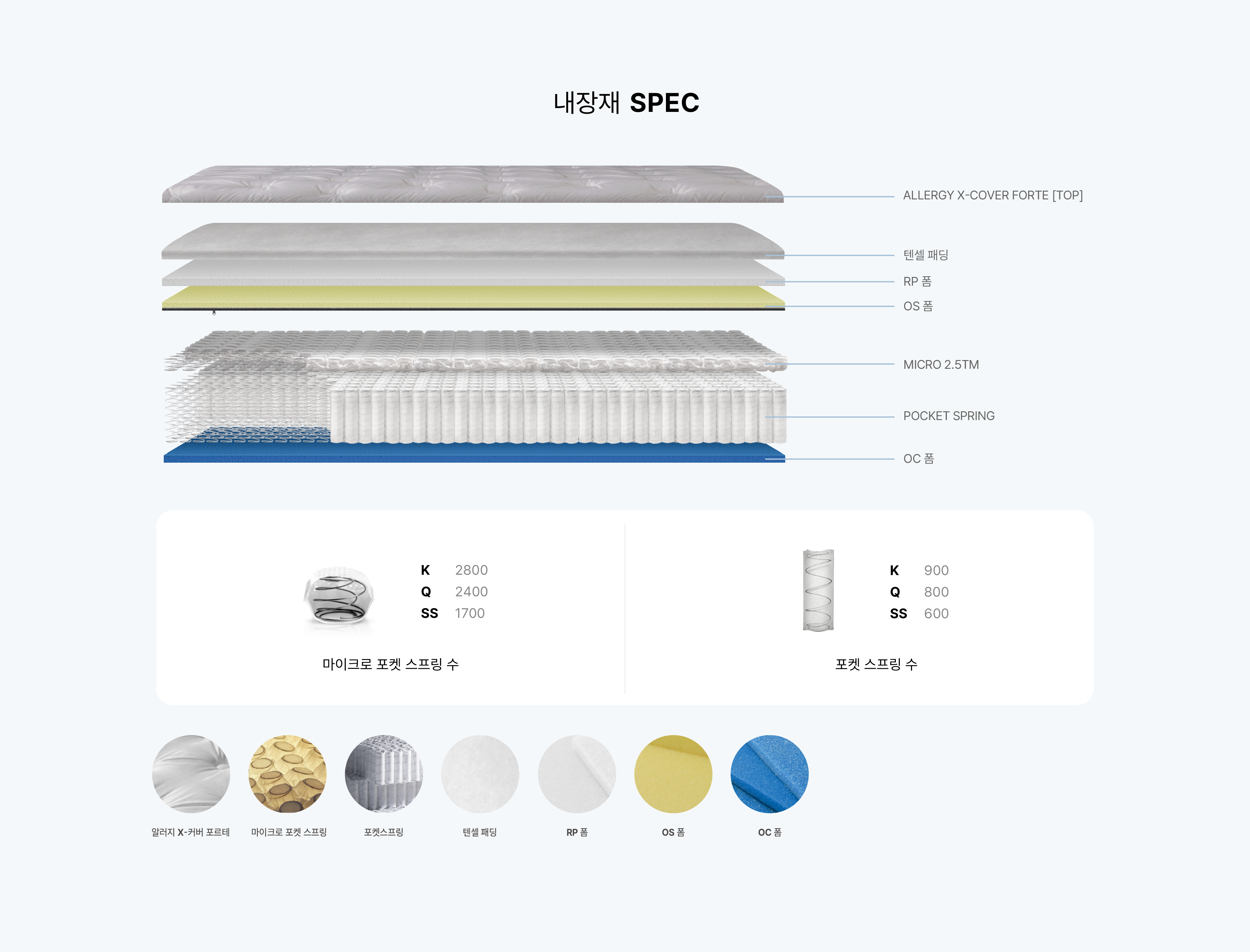 마이크로 포켓 스프링을 장착합니다. 최대 8000개 이상으로 구성된 포켓 스프링들이 결합하여 체압분산 효과가 뛰어나며 안정성 및 내구성, 지지력이 우수합니다.