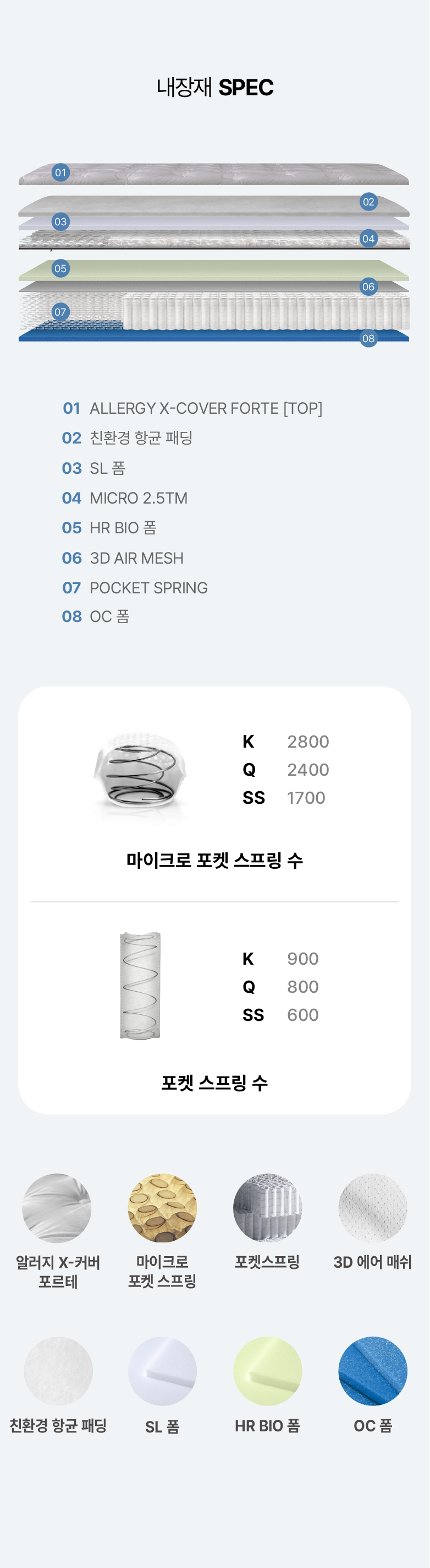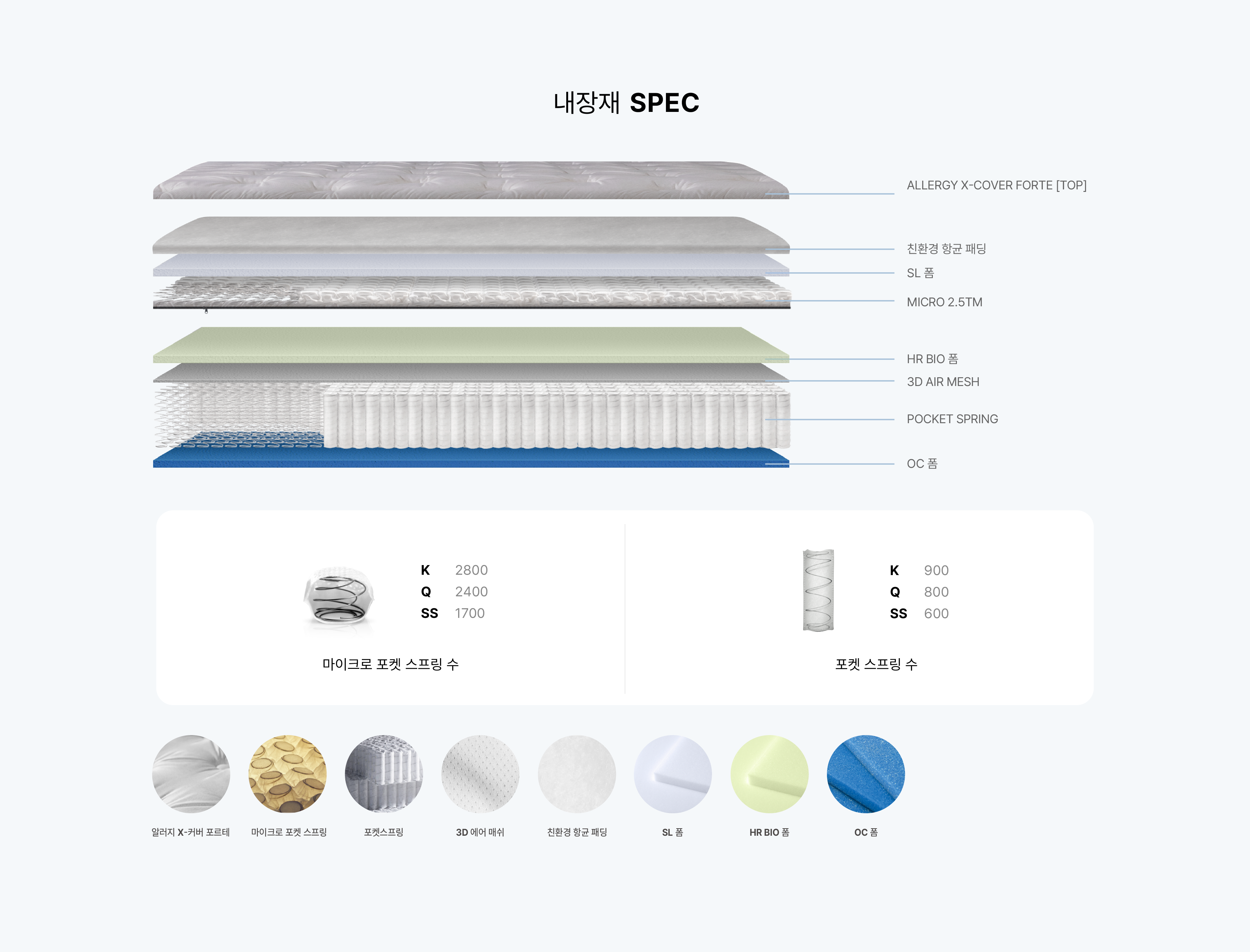 마이크로 포켓 스프링을 장착합니다. 최대 8000개 이상으로 구성된 포켓 스프링들이 결합하여 체압분산 효과가 뛰어나며 안정성 및 내구성, 지지력이 우수합니다.