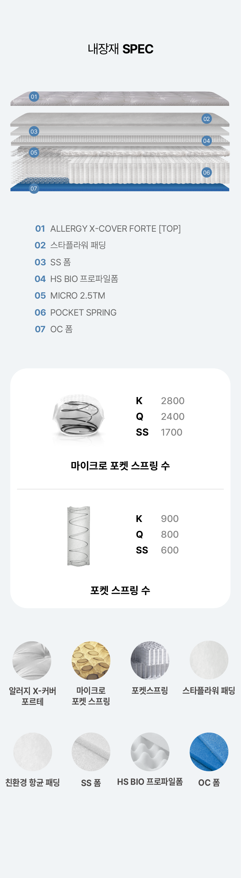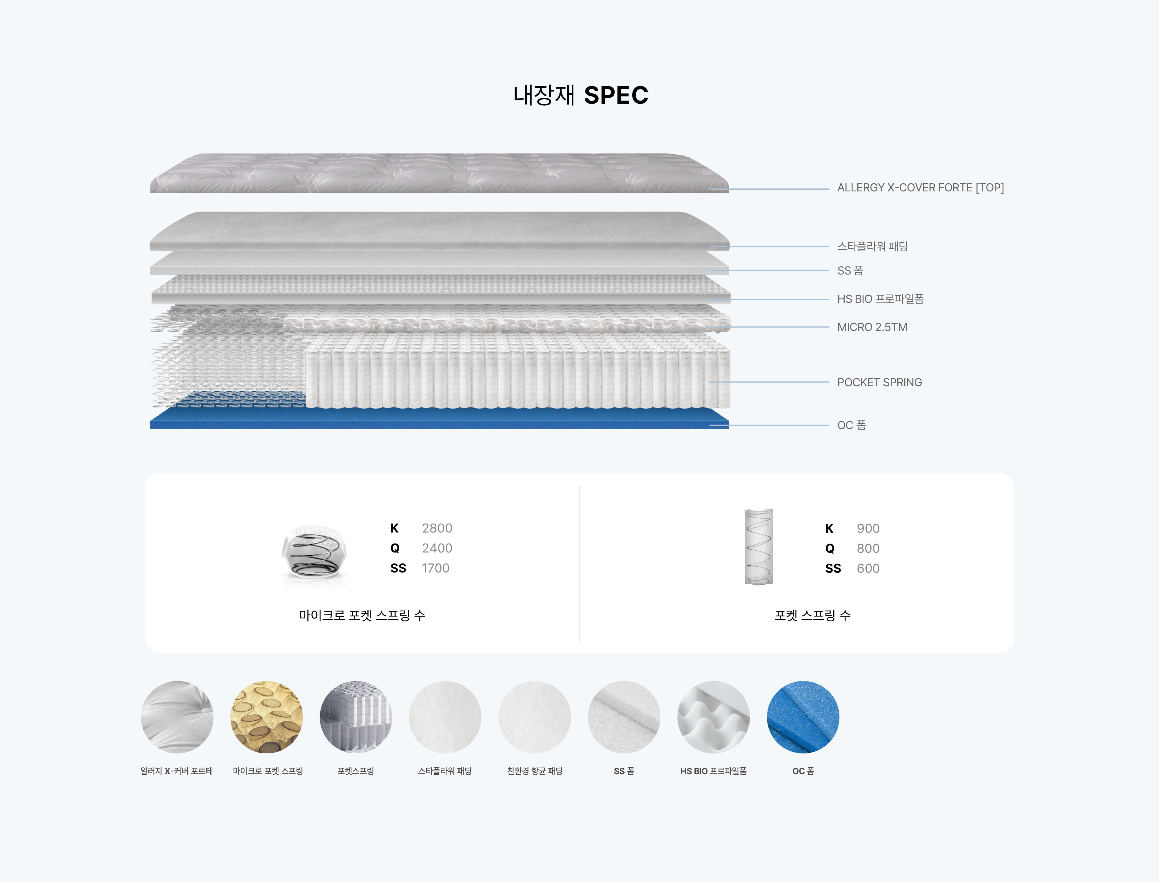 마이크로 포켓 스프링을 장착합니다. 최대 8000개 이상으로 구성된 포켓 스프링들이 결합하여 체압분산 효과가 뛰어나며 안정성 및 내구성, 지지력이 우수합니다.