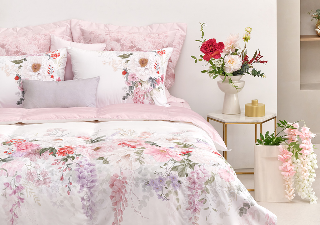 화려한 파리월데코를 연상케하는 리듬감있는 플라워 디자인으로 친츠(Chintz) 스타일의 등나무 꽃은 사랑, 결속의 의미를 담고있어 예단으로 제안하는 제품